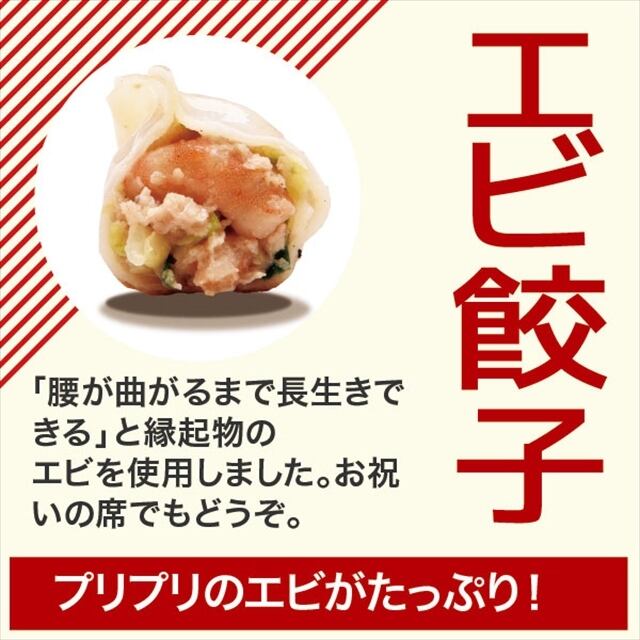 <エビ餃子>皮〔小麦粉(国内製造)、植物油脂、食塩〕、野菜〔きゃべつ(国産)、にら(国産)、にんにく、生姜、長ねぎ〕、エビ(ベトナム)、豚肉(国産)、鶏卵、植物油脂、酒精飲料、醤油、乾椎茸、味噌、砂糖、食塩、黒胡椒/調味料(アミノ酸)、酒精、酸味料、(一部に小麦・卵・えび・大豆・豚肉・ごまを含む)味料、香料、(一部に小麦・卵・大豆・豚肉・ごまを含む)